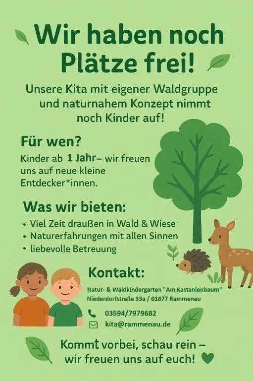 Aktuell gibt es noch freie Plätze in unserer tollen Einrichtung. Kontaktiere und gern für Fragen per Kontaktformular, Mail oder Telefon oder nutze das Anmeldeformular aus dem Downloadbereich.